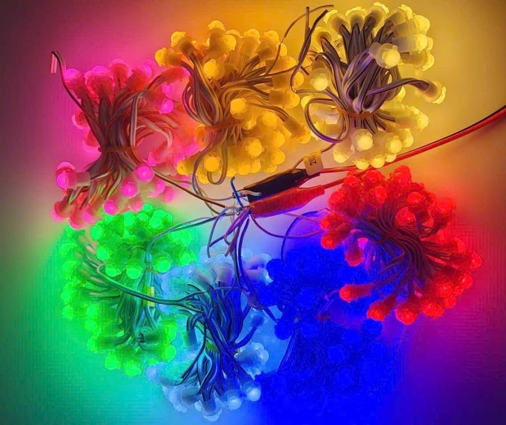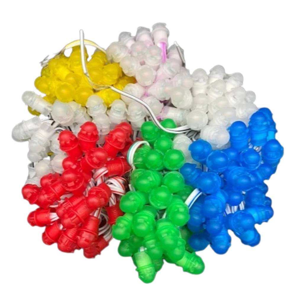 Mỗi dây LED tiêu chuẩn bao gồm 50 bóng được nối liền dây theo sơ đồ song song. Cách đấu nối này mang lại một lợi thế cực lớn trong lắp đặt và vận hành: khi một bóng gặp sự cố hoặc hư hỏng cơ học, toàn bộ 49 bóng còn lại trên dây vẫn hoạt động bình thường, giúp việc kiểm tra và bảo trì trở nên đơn giản hơn bao giờ hết. Khoảng cách giữa các bóng được tính toán ở mức 5cm, giúp dây LED có độ linh hoạt cao, dễ dàng uốn lượn theo các nét chữ phức tạp trong LED biển chữ nổi hay quấn quanh các tán cây trong các dự án LED quấn cây.