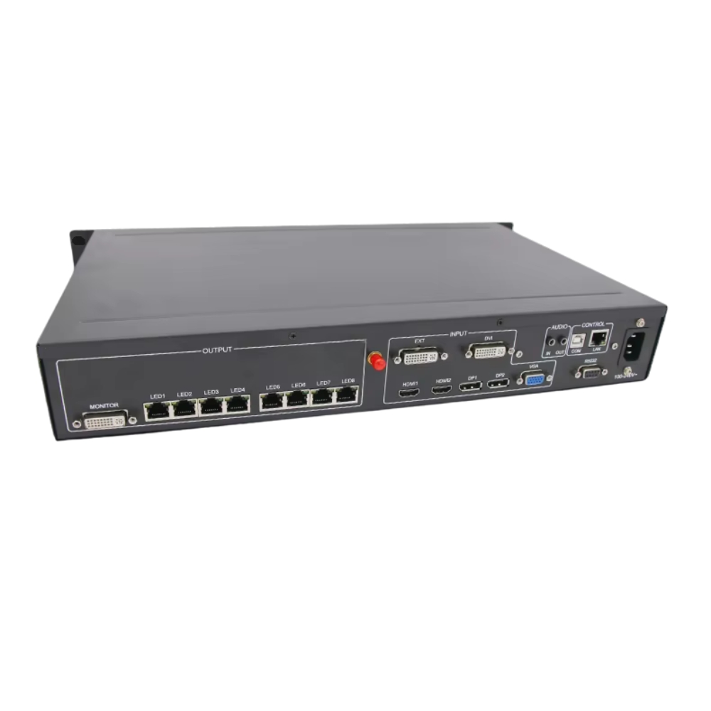 Cổng kết nối đầu ra và Kiểm soát (Output & Control): Sở hữu 8 cổng mạng RJ45 Gigabit, thiết bị đảm bảo tín hiệu được phân tải đều, giúp hình ảnh mượt mà, không bị giật lag (frame drop) ngay cả khi trình chiếu các nội dung chuyển động nhanh như bóng đá hay video quảng cáo hành động. Phương thức điều khiển đa dạng qua WIFI, LAN, USB-B và RS232 mang lại sự tiện lợi tối đa. Đặc biệt, tính năng kết nối WIFI cho phép kỹ thuật viên có thể tinh chỉnh màu sắc, độ sáng màn hình từ xa thông qua Laptop mà không cần ngồi cố định tại phòng máy, cực kỳ hữu ích trong quá trình setup sân khấu sự kiện.