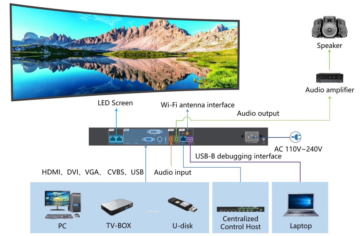 Bộ xử lý hình ảnh HD VP210H WIFI là thiết bị chuyên dụng được thiết kế cho các hệ thống màn hình LED online, đóng vai trò trung tâm trong việc tiếp nhận và xử lý tín hiệu hình ảnh. Khả năng tương thích mạnh mẽ cho phép thiết bị hỗ trợ kết nối đa dạng với các thiết bị ngoại vi như máy tính, camera giám sát, đầu phát HD, TV Box Android... để truyền tải nội dung trực tiếp lên màn hình LED với độ trễ gần như bằng không.