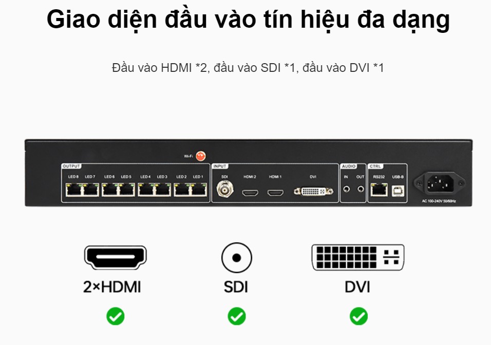 Khác với các dòng phổ thông, Bộ xử lý hình ảnh HD VP830 WIFI được trang bị cổng vào SDI (Serial Digital Interface). Trong các sự kiện như Liveshow ca nhạc, Hội nghị truyền hình hay Lễ kỷ niệm, việc sử dụng tín hiệu SDI là tiêu chuẩn bắt buộc để đảm bảo độ tin cậy. Cổng SDI sử dụng đầu nối BNC có khóa chốt chắc chắn, giúp dây tín hiệu không bị tuột khi có va chạm hoặc rung động mạnh trên sân khấu. Hơn nữa, tín hiệu SDI có khả năng truyền đi xa hàng trăm mét mà không bị suy hao, giúp kết nối từ bàn kỹ thuật đến màn hình LED luôn sắc nét, độ trễ cực thấp, đảm bảo hình ảnh trên màn khớp hoàn toàn với âm thanh thực tế.