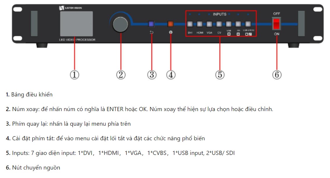 Bộ xử lý hình ảnh Listen VP1000X là giải pháp công nghệ hiện đại được thiết kế chuyên biệt cho các hệ thống màn hình LED hoạt động theo chế độ online (trực tuyến). Thiết bị này đóng vai trò như một trạm trung chuyển và xử lý tín hiệu mạnh mẽ, hỗ trợ kết nối đa dạng với nhiều thiết bị ngoại vi phổ biến hiện nay như máy tính điều khiển, hệ thống camera quay trực tiếp, đầu phát kỹ thuật số, TV Box và nhiều nguồn phát tín hiệu khác. Nhiệm vụ cốt lõi của thiết bị là tiếp nhận, xử lý và đồng bộ hóa các tín hiệu này để hiển thị trực tiếp lên màn hình LED với độ trễ thấp nhất và chất lượng hình ảnh trung thực nhất.