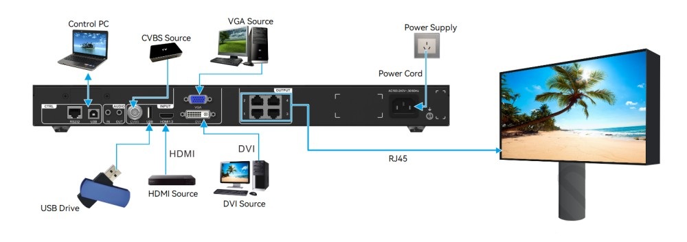 Thiết bị vận hành ở chế độ Online, kết hợp chặt chẽ với mạch điều khiển Novastar để trình chiếu các hiệu ứng phức tạp, văn bản sắc nét và video mượt mà.