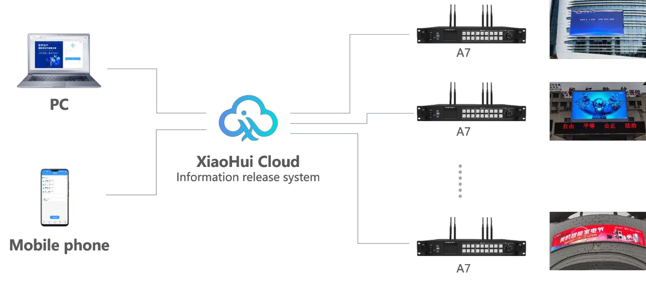 Quản lý qua Cloud: Giải pháp quản lý tập trung tối ưu cho các hệ thống quảng cáo phân tán. Người quản lý có thể cập nhật nội dung cho hàng loạt màn hình tại các vị trí địa lý khác nhau thông qua nền tảng Huidu Cloud.