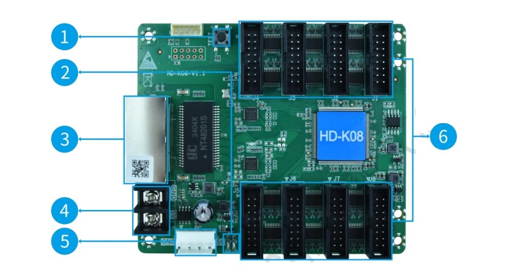 HD K08 được định danh là Card thu phát LED (Receiving Card). Đây là thiết bị cuối cùng trong chuỗi truyền tín hiệu trước khi đến tấm module LED. Nhiệm vụ của nó là "thu" tín hiệu từ card phát (Sending Card) hoặc bộ xử lý (Processor) qua cổng RJ45, giải mã dữ liệu đó và "phát" tín hiệu điều khiển cụ thể ra các cổng HUB75 để "vẽ" nên hình ảnh trên màn hình.