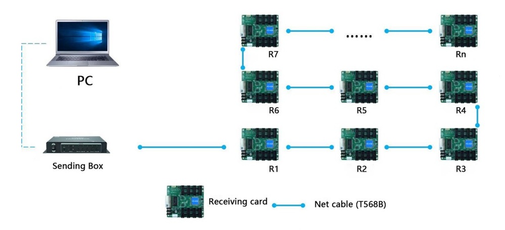 Kết nối nhiều card: Đây là tính năng Cascading (nối tiếp). Tín hiệu từ card phát đi vào cổng "RJ45 IN" của card K08 đầu tiên. Sau đó, tín hiệu từ cổng "RJ45 OUT" của card 1 sẽ đi vào cổng "IN" của card 2, và cứ thế tiếp tục. Kỹ thuật này cho phép hàng trăm Card thu HD K08 được kết nối với nhau để xây dựng các màn hình LED khổng lồ hàng trăm mét vuông chỉ với một tín hiệu gốc.