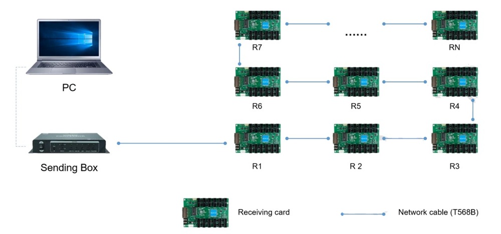 Phương thức điều khiển thông qua cổng mạng RJ45 là một tiêu chuẩn vàng, đảm bảo kết nối vật lý chắc chắn, tốc độ truyền tải dữ liệu Gigabit nhanh chóng và khả năng chống nhiễu vượt trội. Card được thiết kế để hoạt động đồng bộ, có thể kết hợp với bộ xử lý hình ảnh, card phát, và đặc biệt là khả năng kết nối nhiều card nối tiếp với nhau. Tín hiệu từ card phát sẽ đi vào cổng RJ45 đầu vào, và được truyền tiếp đến card thu kế tiếp thông qua cổng RJ45 đầu ra. Cơ chế này cho phép mở rộng kích thước màn hình gần như không giới hạn một cách đơn giản và hiệu quả.