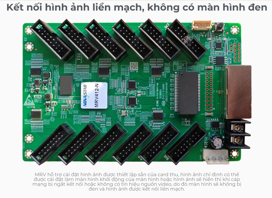 Trong một cabinet LED ngoài trời hoặc một màn hình LED trong nhà hoạt động 24/7, nhiệt lượng là kẻ thù số một. Nhiệt lượng cao làm giảm tuổi thọ của bóng LED, nguồn (PSU) và chính card thu. Việc MRV412-N tỏa nhiệt ít giúp toàn bộ hệ thống bên trong cabinet hoạt động mát mẻ hơn đáng kể, tăng tuổi thọ tổng thể của màn hình và giảm hiện tượng suy giảm độ sáng (brightness decay) theo thời gian.