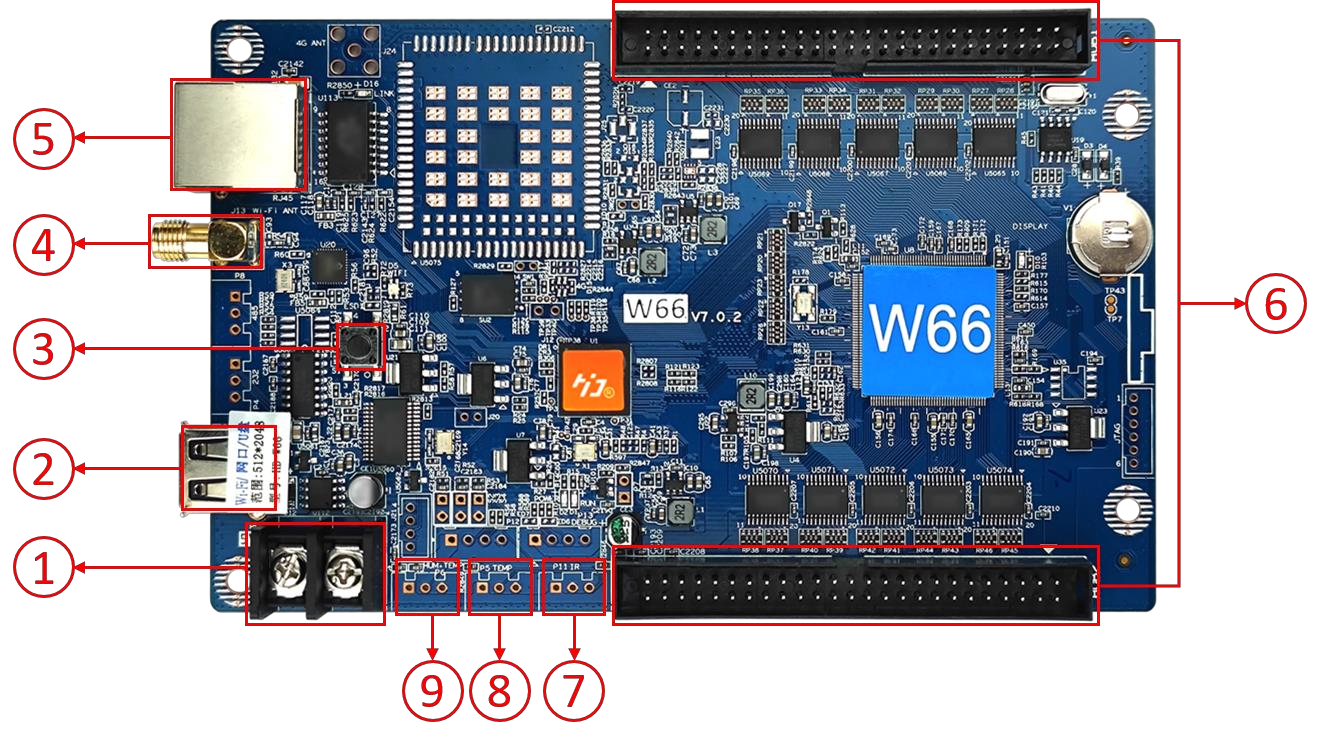 Ảnh 1. Mạch điều khiển HD W66 WIFI DK14 kèm HUB75Bx8 (Mã: AD45578-1)Ảnh 2. Thiết kế mặt sau mạch điều khiển HD W66 WIFI DK14 kèm HUB75Bx8 (Mã: AD45578-2)Ảnh 3. Mạch điều khiển HD W66 WIFI DK14 kèm HUB75Bx8 và phụ kiện (Mã: AD45578-3)