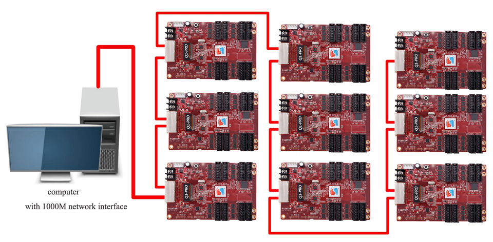 Đây là tính năng cao cấp và đắt giá nhất của Mạch Listen Q1. Nó cho phép bạn kết nối (cascade) nhiều card Q1 lại với nhau để điều khiển một màn hình LED duy nhất có kích thước khổng lồ, vượt xa giới hạn của một card đơn lẻ.