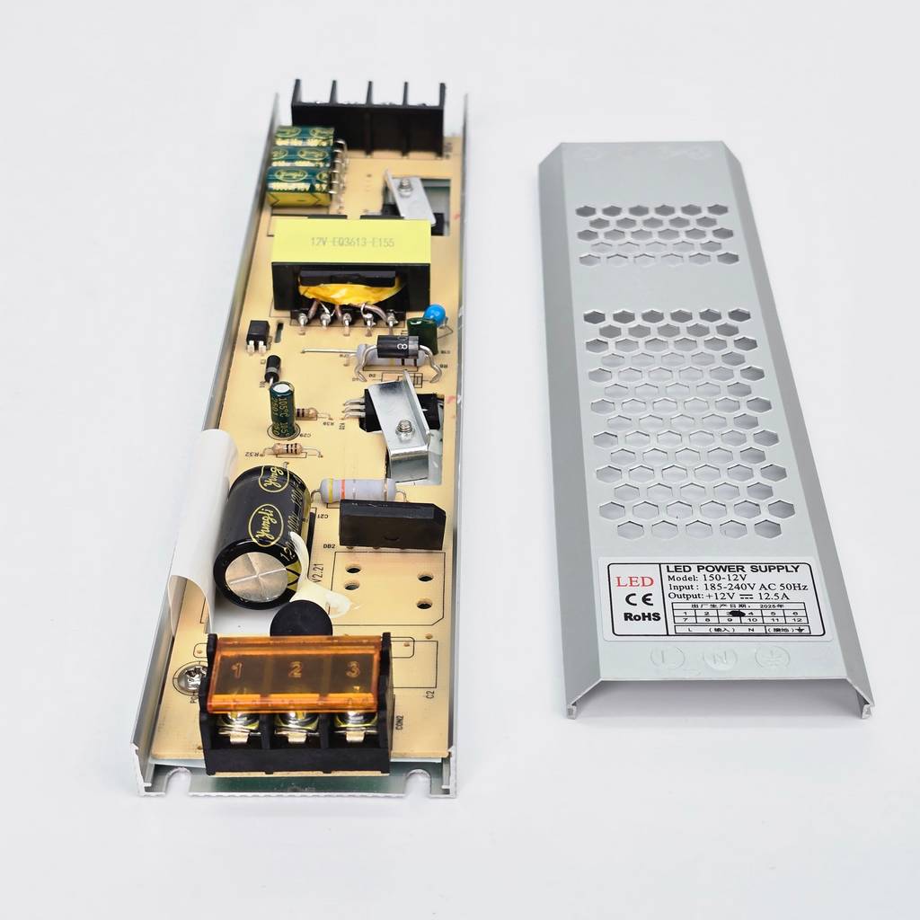 Nguồn 12V 12.5A trong nhà là "trái tim" của hệ thống điện một chiều, thực hiện nhiệm vụ quan trọng là chuyển đổi dòng điện xoay chiều (AC) từ lưới điện dân dụng sang dòng điện một chiều (DC) có điện áp thấp 12V. Với công suất định mức 150W, được tính toán dựa trên công thức điện năng cơ bản ($P = U times I$, tương đương $12V times 12.5A$), đây là mức công suất lý tưởng, đủ mạnh mẽ để tải các hệ thống LED dây dài hoặc các bảng hiệu có mật độ bóng dày đặc mà vẫn giữ được kích thước nhỏ gọn.