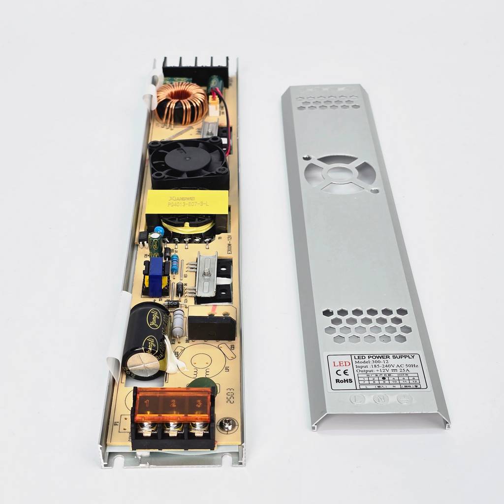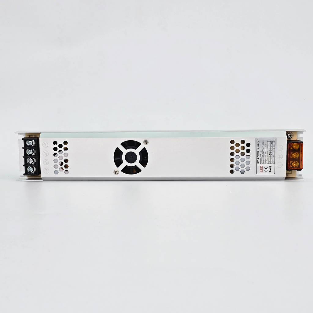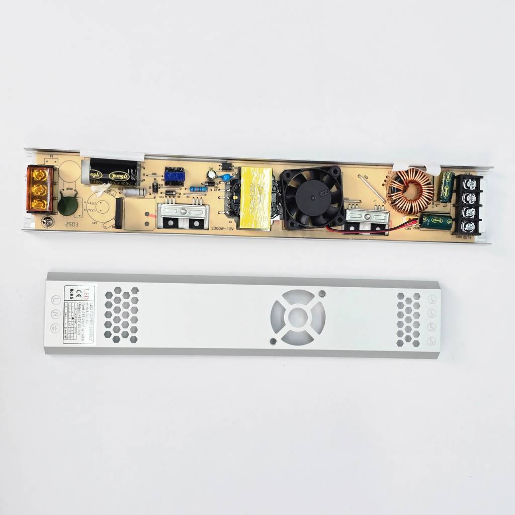 Mặc dù có thiết kế nhỏ gọn, nhưng bộ Nguồn 12V 25A này vẫn được trang bị quạt tản nhiệt thông minh. Quạt sẽ hoạt động dựa trên cảm biến nhiệt độ bên trong, giúp đẩy hơi nóng ra ngoài một cách nhanh chóng, đảm bảo các linh kiện như tụ điện và biến áp luôn làm việc trong ngưỡng nhiệt độ an toàn. Điều này cực kỳ quan trọng đối với nguồn LED nội thất khi thường xuyên phải lắp đặt trong các vị trí kín như trần thạch cao hoặc tủ gỗ.