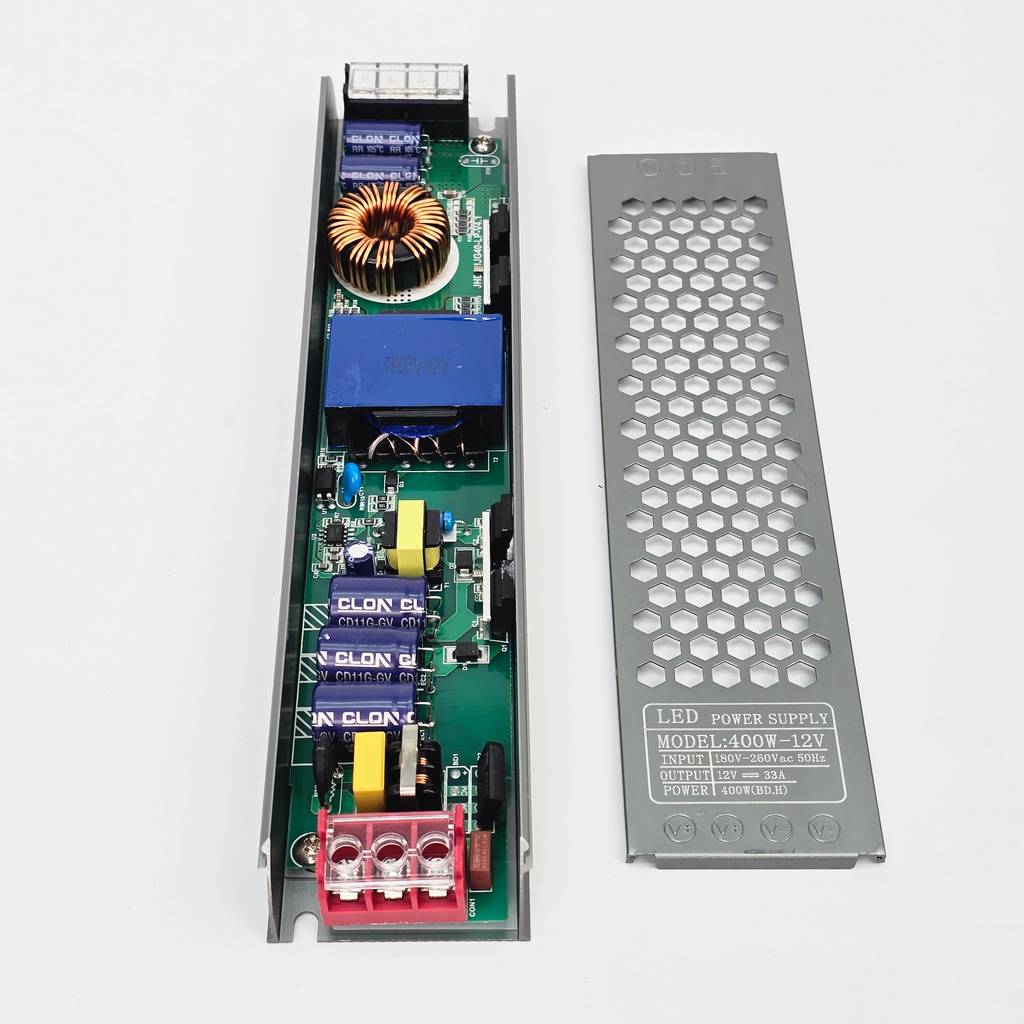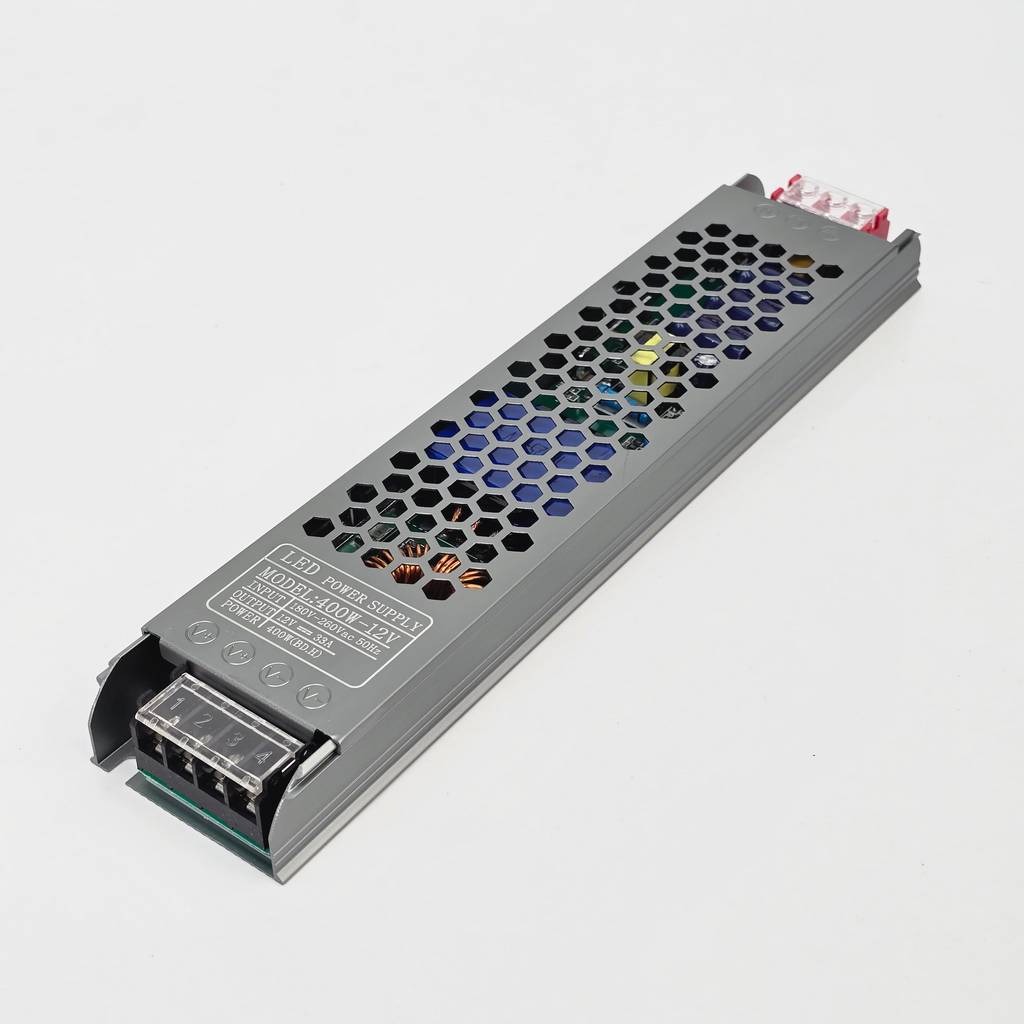 Nguồn 12V 33A dẹt mỏng là một thiết bị chuyển đổi điện năng chuyên dụng, đóng vai trò là "trái tim" cung cấp năng lượng cho toàn bộ hệ thống LED và thiết bị điện tử chạy áp thấp. Thiết bị thực hiện nhiệm vụ biến đổi dòng điện xoay chiều AC 220V từ lưới điện lưới thành dòng điện một chiều DC 12V với cường độ lên đến 33A, tương ứng với mức công suất mạnh mẽ 400W. Điểm khác biệt lớn nhất nằm ở cấu trúc vật lý siêu mỏng, cho phép người dùng dễ dàng giấu nguồn vào các khe nhôm, vách thạch cao hay các hộp biển hiệu siêu mỏng mà không cần tốn quá nhiều diện tích.