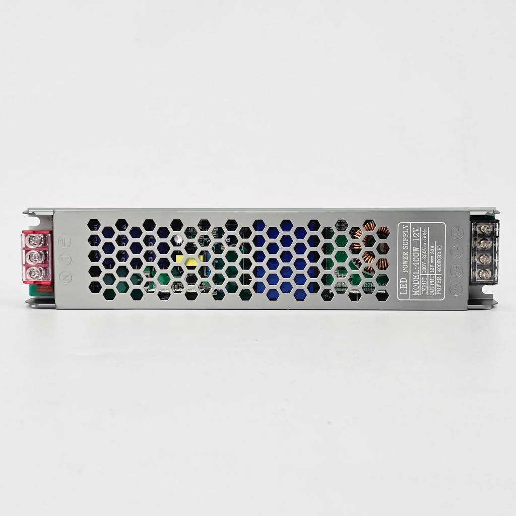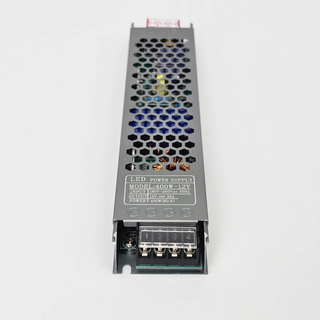 Với dòng điện đầu ra 33A chuẩn xác, bộ nguồn cung cấp một mức năng lượng dồi dào, đủ sức gánh những hệ thống LED dây COB mật độ cao hoặc các loại LED module 3 bóng cho các biển hiệu quảng cáo khổ lớn. Công suất 400W được duy trì ổn định, giúp ánh sáng phát ra đều màu từ điểm đầu đến điểm cuối của dải LED, loại bỏ hoàn toàn hiện tượng sụt áp gây tối dần ở cuối đường dây – một lỗi kỹ thuật thường gặp nếu sử dụng nguồn công suất thấp hoặc kém chất lượng.